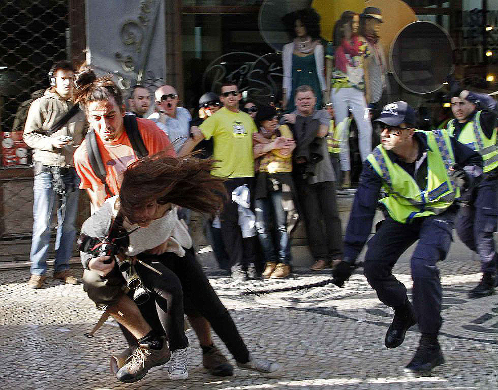 Un agente golpea a Patricia Melo, fotoperiodista de la agencia AFP, durante la carga policial en la manifestación de la capital portuguesa.